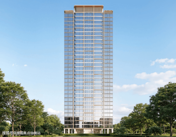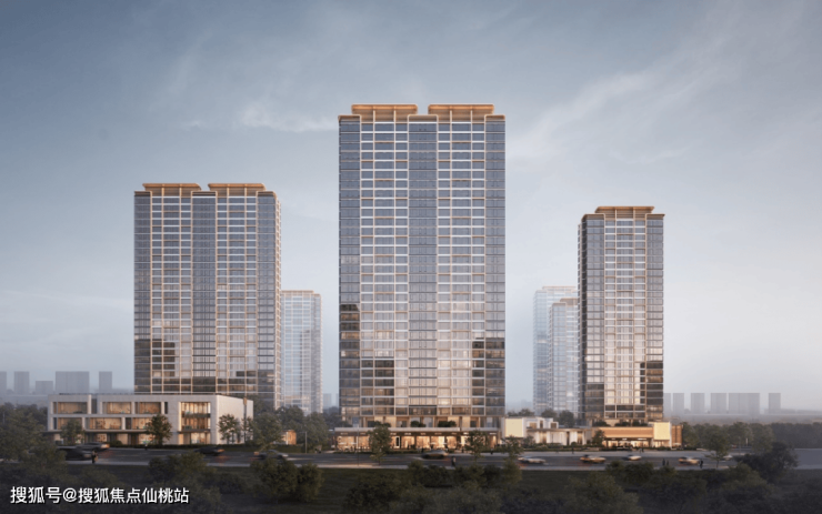 +铝板,把近人尺度的品质感拉满。顶部塔冠采用弧形元素,配合香槟金色金属材料,成为本小区标志性的灯塔符号。建筑形体规整,线条明细,呈现出精致的现代典雅风格,构建出长沙品质住宅小区的标杆形象。