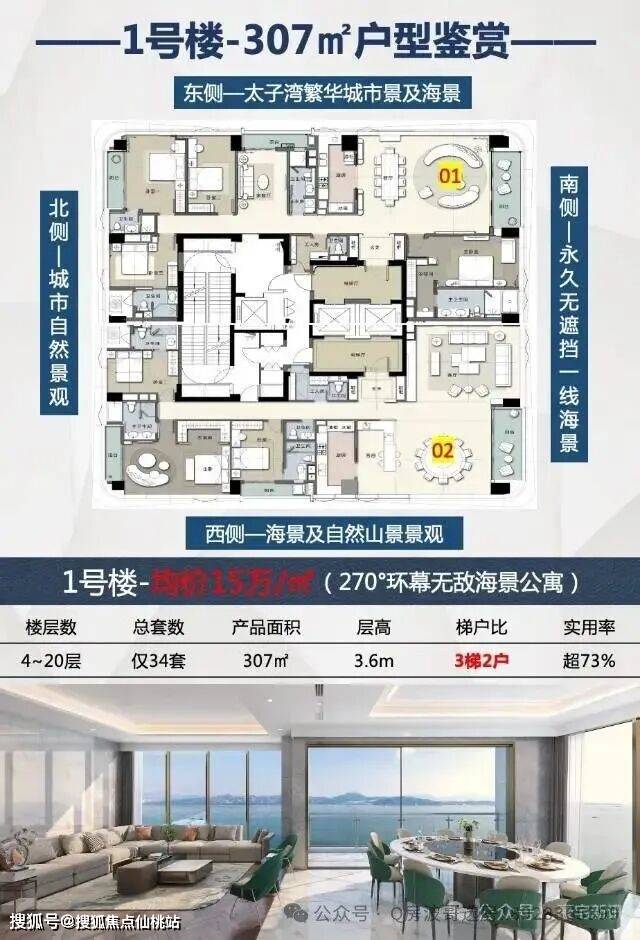 景观优势:约13米大面宽客餐厅连接,搭配近9米海景阳台,提供IMAX般壮阔视野· 空间布局:3.6米层高营造舒适空间感;三阳台设计保证采光通风;五房配置满足多代同堂需求· 户型亮点:全功能主卧套间+父母套间+小孩房+工人房的完整配置,媲美家族大宅🐳 太子湾·鲸域 1号楼 307㎡ 奢华体验:亲海阳台总面宽超12米,呈现无遮挡永久一线海景