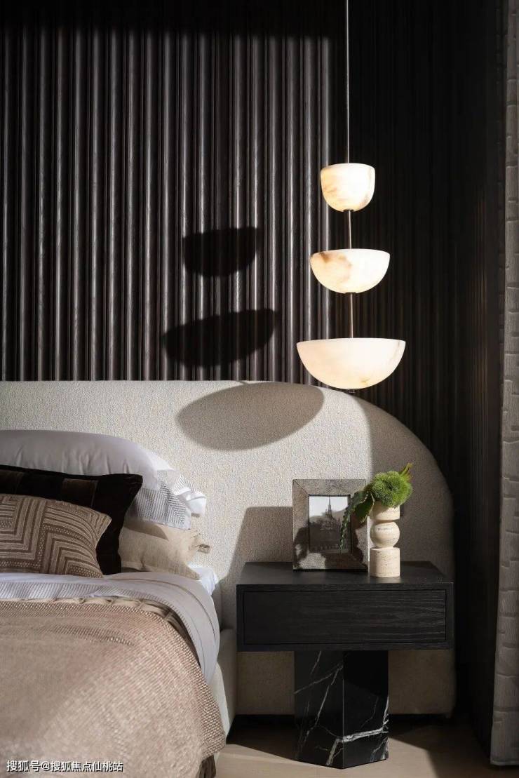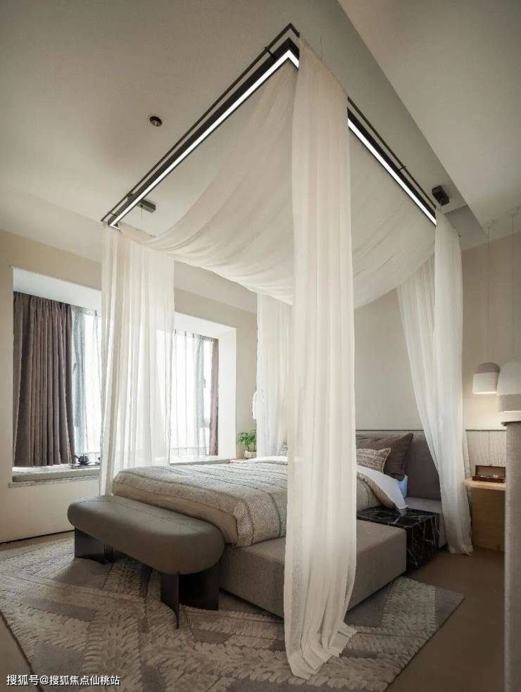 帷幔自然垂落增加了空间的灵动感,如梦似幻,打造一个“沉浸式”的空间氛围,独特的肌理感突出了细节层次,细腻而柔软的线条肆意舒展,使整个空间温柔而不失张力。