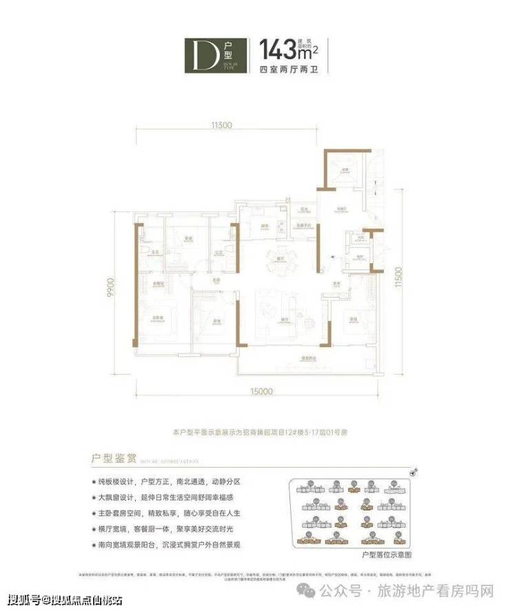 D户型:建筑面积约143㎡,4室2厅2卫。奢华四房,户型方正,布局紧凑,功能分区明确;灵动空间设计,广阔观景视野;卧室均带飘窗设计,让生活起居真正接近阳光;大面宽阳光客厅,格局方正严谨,彰显大家风范;客厅外接观景阳台,和自然零距离接触。