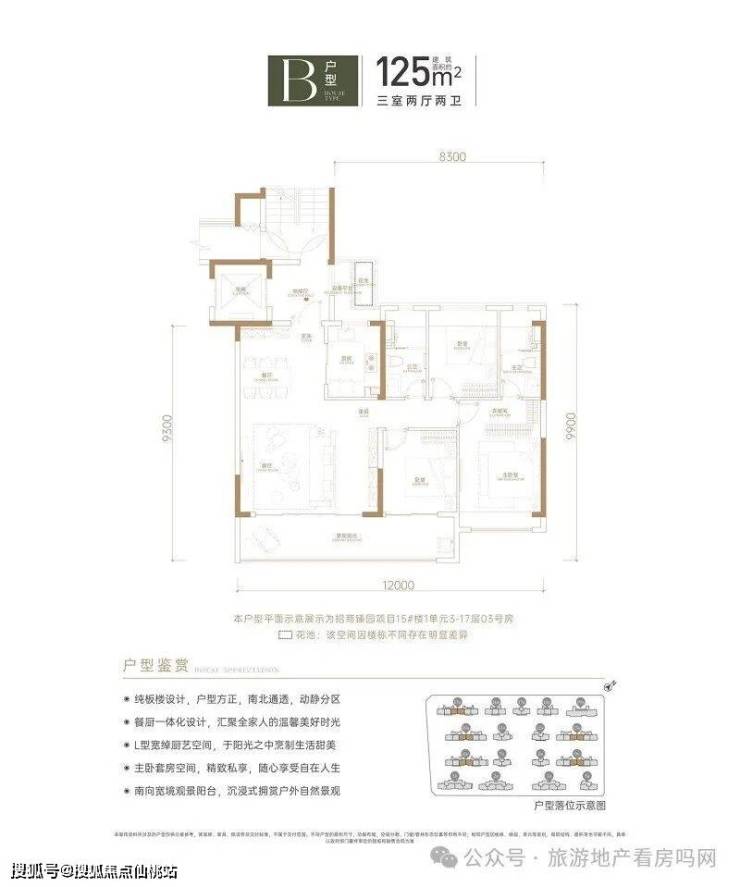 B户型:建筑面积约125㎡,3室2厅2卫。户型方正,全明设计,通透舒适;客厅餐厅功能分区明确,生活动线合理设置,会客、休息互不干扰;主卧套房设计,私密性强,空间开阔,朝南而向;L型超大厨房,明亮空间施展大厨艺。