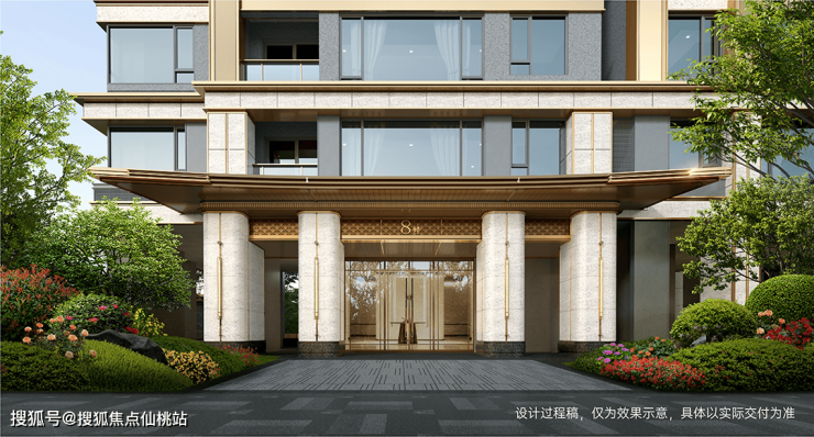 项目以高标准精筑楼栋入户,双飞檐门头勾勒东方意蕴,与整体建筑优雅共鸣,辅以石材幕墙、香槟金铝板、超白钢化夹胶玻璃,共筑高级质感门庭,极大提升入口昭示性及归家尊崇感。
