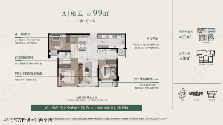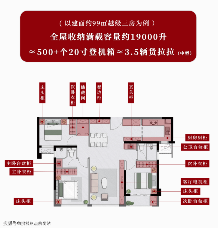 以建面约99㎡户型为例,全屋收纳满载容量约19000升,可装下约500+个20寸登机箱!配备独立储藏间,同时在玄关处、厨房、卫浴间等高频率生活场域,均预留储物空间;在餐厅、客厅等社交型场域,充分利用墙体宽度嵌入超长柜体;卧室则融入步入式衣帽间或预留衣柜空间等;阳台上亦配置多元储物柜,让家里所有的物品都能各得其所。