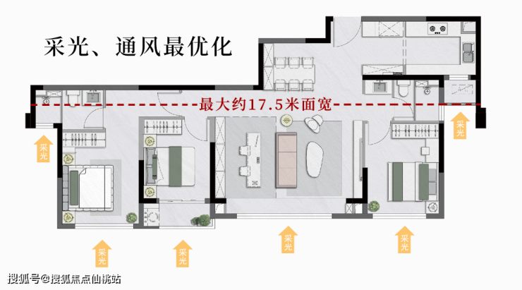 尺度升级!项目全系户型皆为3-5开间朝南设计,南向面宽约12.4-17.5米(含墙),室内采光、通风效果实现最大优化,南北通透,视野效果及舒适度也都更上一层。