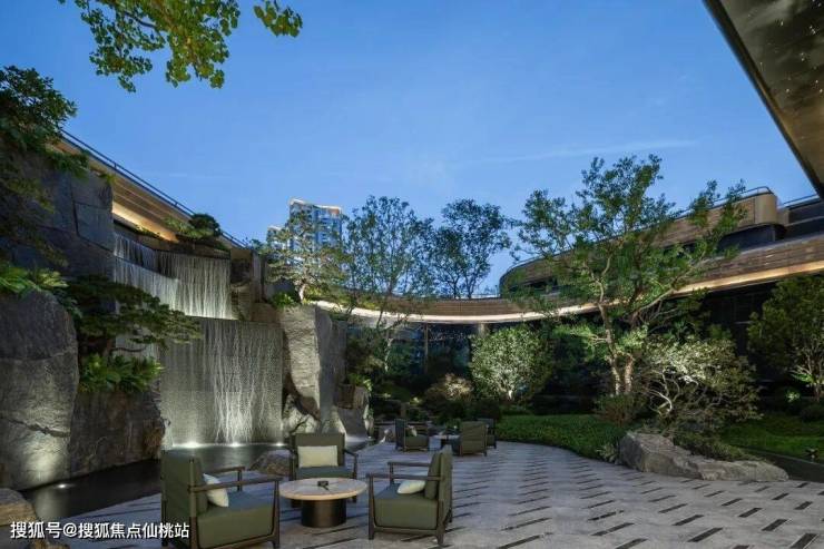 华樾小区园林秉承“外得江湖、内得山水”的造景理念,将传统园林的空间手法转移到园区内部,形成营山置水、建廊种树、以小见大、造廊架桥、堆山引水的前庭后园,再依托层层退台的建筑形态打造山水园林景观。