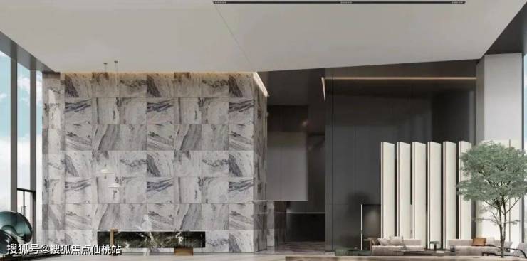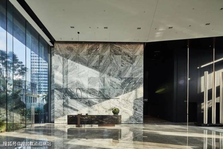 大堂及接待中心,将建筑带入艺术创造的纯粹境界,选用古奇黑石材为接待台,配以大面积的石材上墙,于10.2米的极致挑高中,将线条与空间相融,融合湾海意境,使其层次分明兼具连续性且更有韵律感,在城市肌理脱颖而出,提升整体的空间质量。