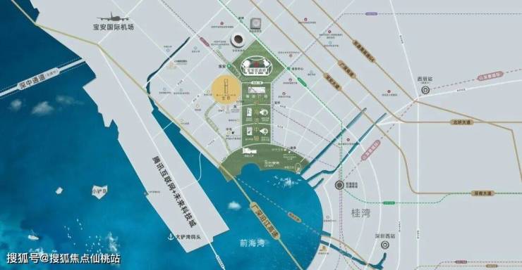 陆:亚州最大交通枢纽——前海综合交通枢纽、妈湾跨海大道、广深沿江高速、深惠城际铁路(在建)、深港西部快轨、深中通道(在建)、滨海大道、穗深城际线、深珠城际线、深茂铁路深圳段