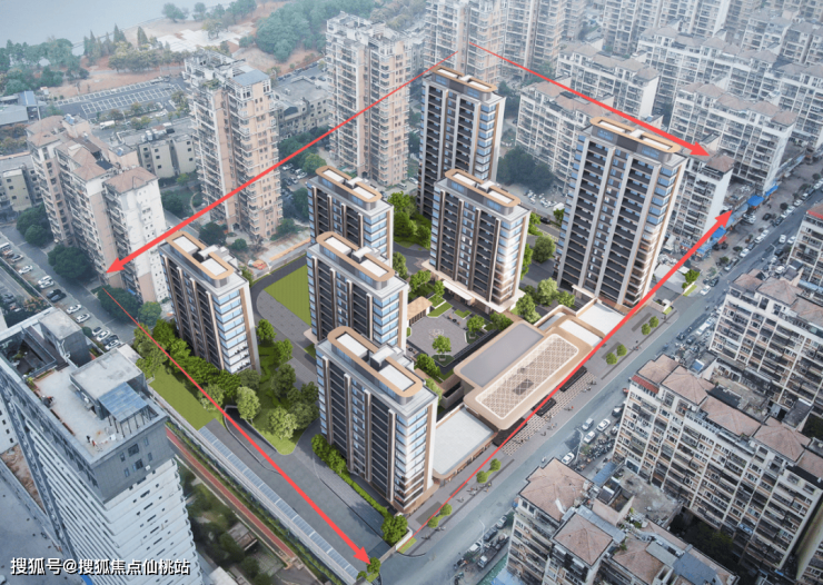 楼栋立面为香槟金配色,山墙部分大面积开窗,展现了产品的新规特性,和周边十里桃花安置房小区代差感明显。
