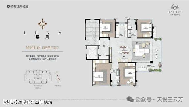 独立电梯厅,270°转角窗,270°L型阳台,星级酒店式主卧,约8.1m奢阔端厅。