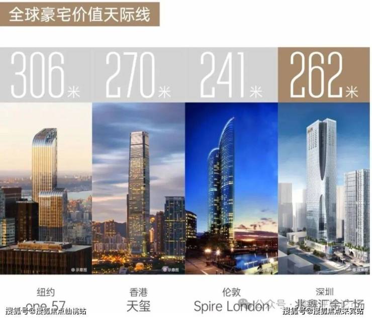 【仰望·天际】兆鑫汇金广场,深南大道封面地标,以其262米的超人之姿比肩全球顶级豪宅。世界顶级豪宅同样存在着一条价值天际线——纽约的one 57、香港的天玺、伦敦的Spire London,包括深圳的深圳湾壹号,作为各自区域的最高居所,矗立于当地人居的价值之巅。