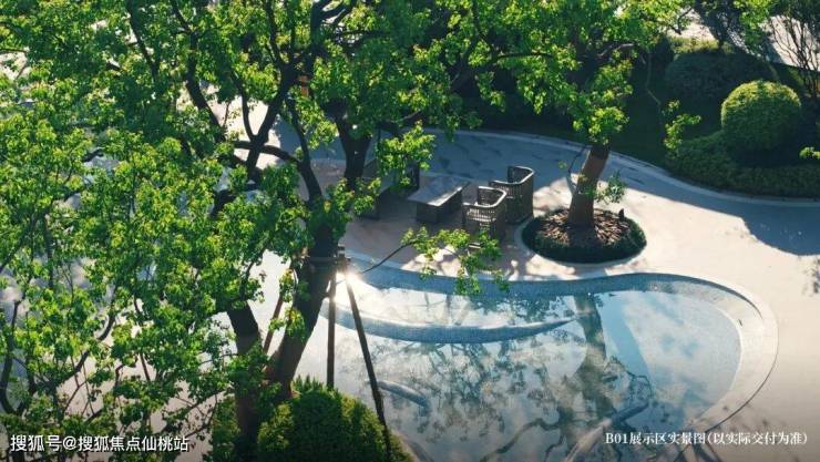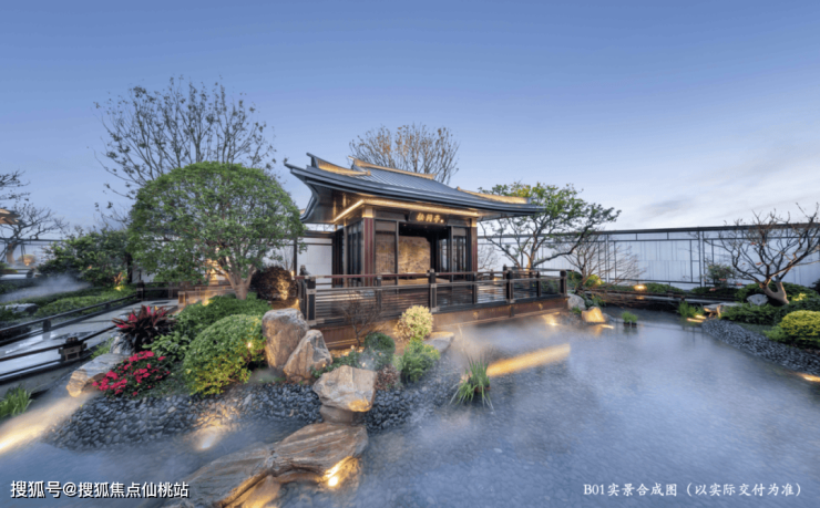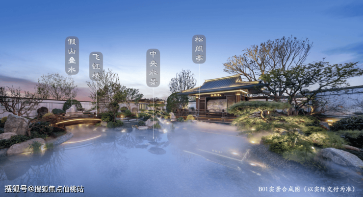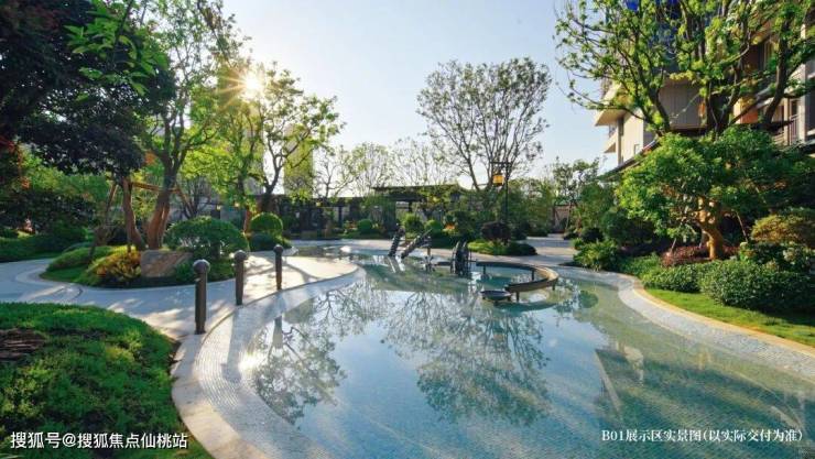 撷取唐宫太液池“一池三山”格局精粹,约360㎡中轴核心水景已然实景呈现。辅以自然碎石铺底,自然与人造景观的和谐统一,犹如一个天然的生态湖泊。