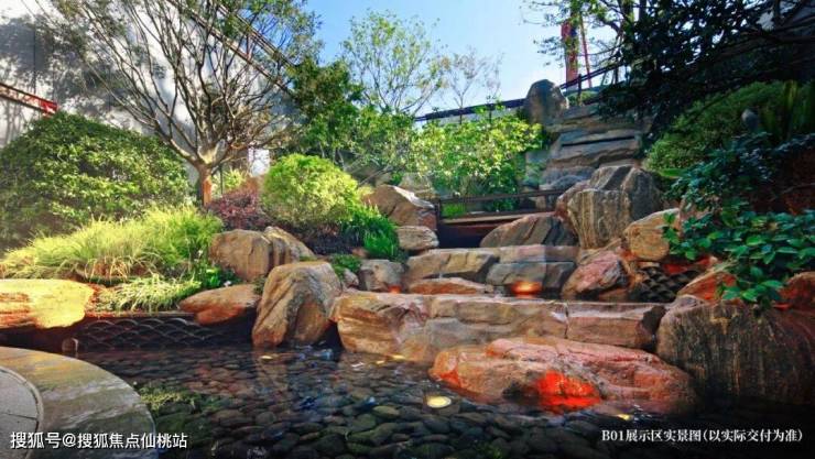 约4m深的层次构造,将潺潺的流水融入自然造景中,东方美学与近距离归家的功能性精妙融合,同时也让地库采光更通透。