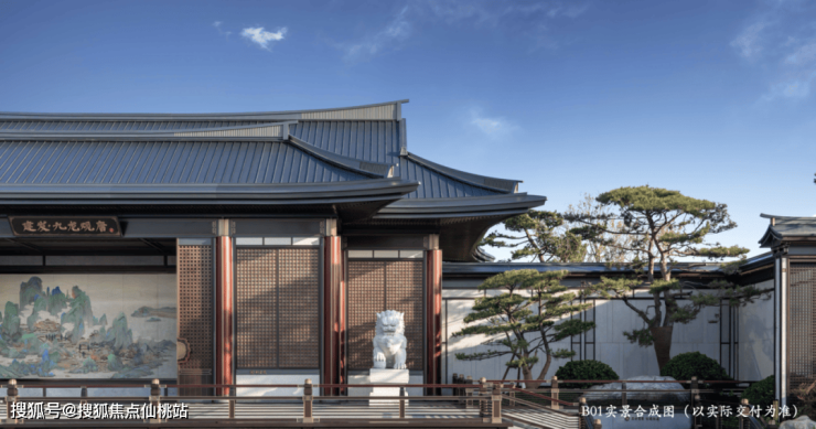 高达10米,宽约49米的实景唐风大门,8级台阶拾级而上,迎客松下卧石邀客,双狮佑府,尽彰盛唐气度。