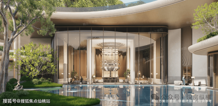 匠造「地下落客-首层迎宾-上层漫游」创新三重立体归家礼序,将东方吉祥寓意融入归家动线。主入口东向而开,承紫气东来祥瑞;约9米挑高车马厅,蕴九五至尊之吉;臻植造景藏八方来财;圆穹顶纳天圆地方格局,其下圆形水景藏风,生水起之兆。每一步皆有光影随行,步步藏礼,层层见境,归家即归心。