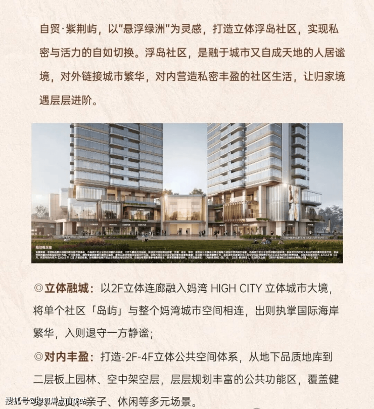 打造立体浮岛社区,2F立体连廊融入妈湾立体城市,出则繁华、入则静谧;-2F-4F立体公共空间,覆盖健身、社交、亲子等多元场景,居住体验拉满。