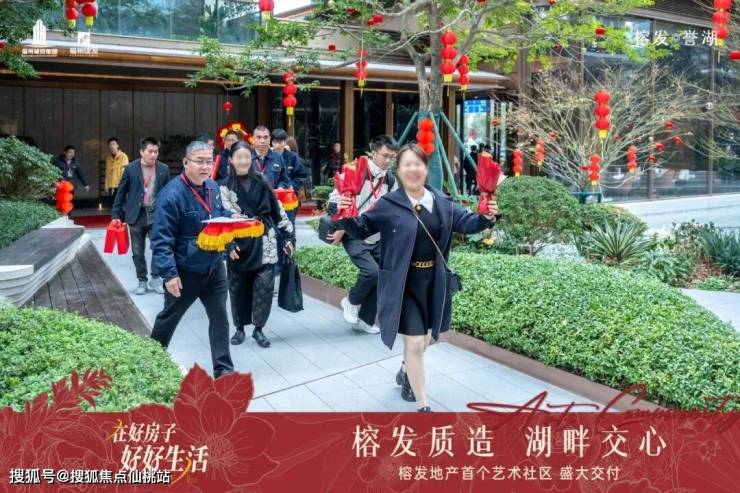 交付现场,处处洋溢着温暖而庄重的仪式感。红色地毯从社区主入口一路延伸,身着工装、佩戴绶带的榕发工作人员与礼仪人员早已准备就绪,以真诚的微笑迎接每一位归家的业主。现场精心布置的交付指引清晰明了,每一个环节都流畅而高效。