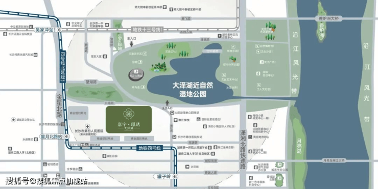 临江可遇,湖岛难求。嘉宇·璟琇以湘江、大泽湖、月亮岛三大自然为核,形成独特的"江-湖-岛"生态优居体系,同享交通、科创、教育、商业、医疗等核心资源。