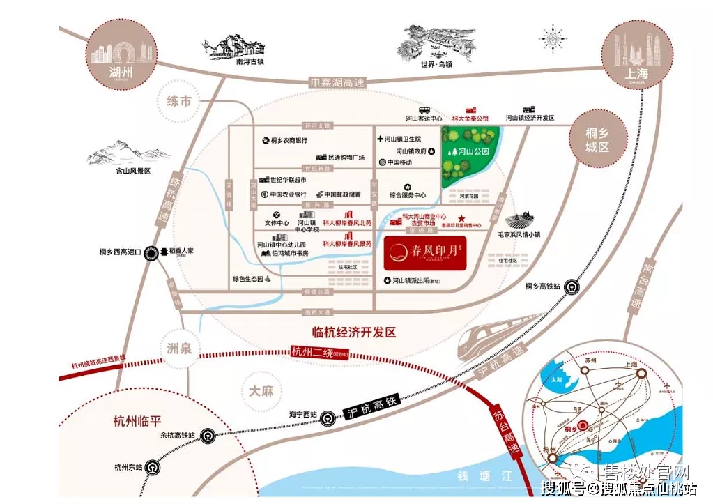 春风印月里,矗立于临杭新区-河山,长三角城市中心地带,申嘉湖、杭练高速环绕四周,桐德公路、临杭大道贯穿桐杭,S13高速“桐乡西”出口斜贯境内,邻高速口,近高铁站,交通便捷,通达全域。