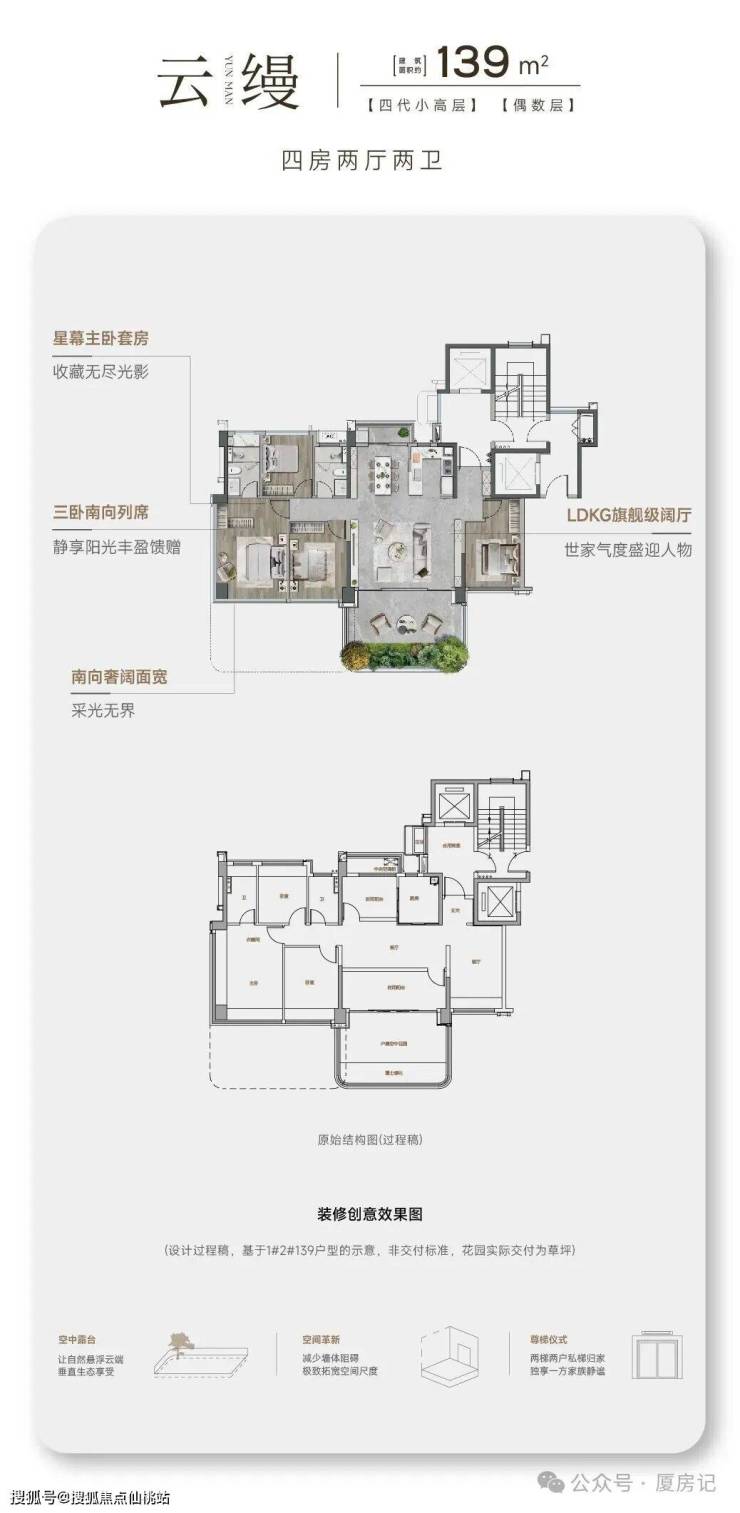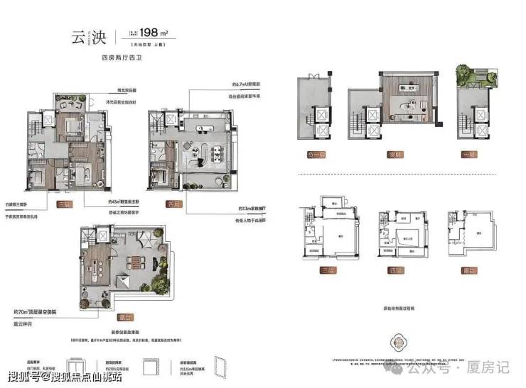 •有129-139㎡四代小高层,174㎡复式空中墅,188㎡大平层,172-198㎡6层院墅,189-198㎡4层院墅,266㎡合院等户型;除少量3套188平大平层和8套266平独栋别墅毛坯交付外,其余均精装修交付;