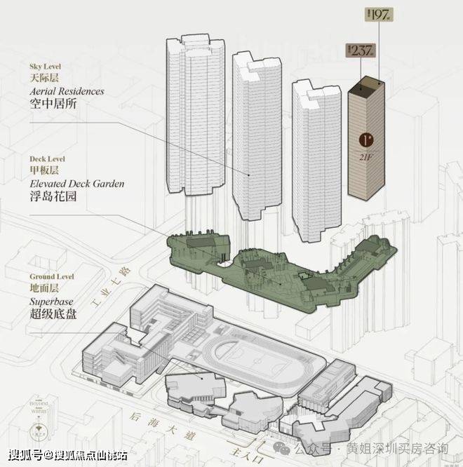 招商玺在建筑设计上采用了创新的“浮岛甲板"策略,四栋住宅落于甲板之上,独享甲板庭院花园,进而形成超级社区地盘+浮岛绿化甲板的垂直共生人居标杆。