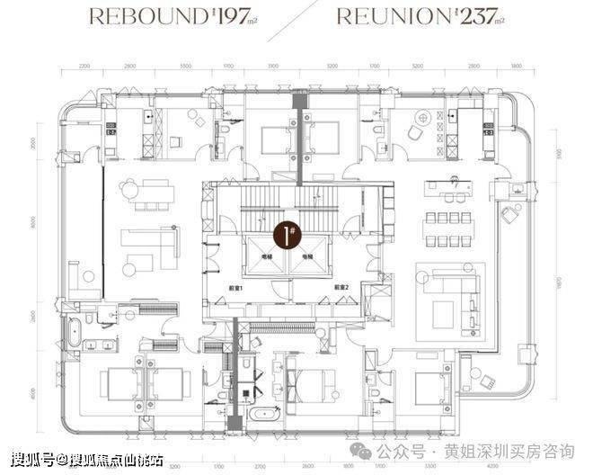 「后海招商玺」此次首推1栋小高层住宅,2T2户,专梯入户,户型为建面约197-237㎡的四房大平层。