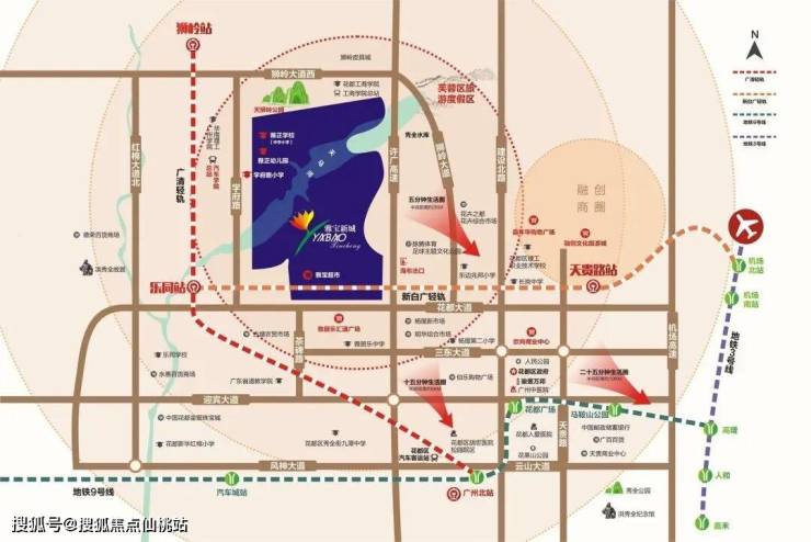 雅宝新城位于广州的花都区,占地100多万平方米,总建筑面积90多万平方米,天马河穿过该项目,紧邻广州新机场快线,小区配有多条专线往返广州、港澳之间。