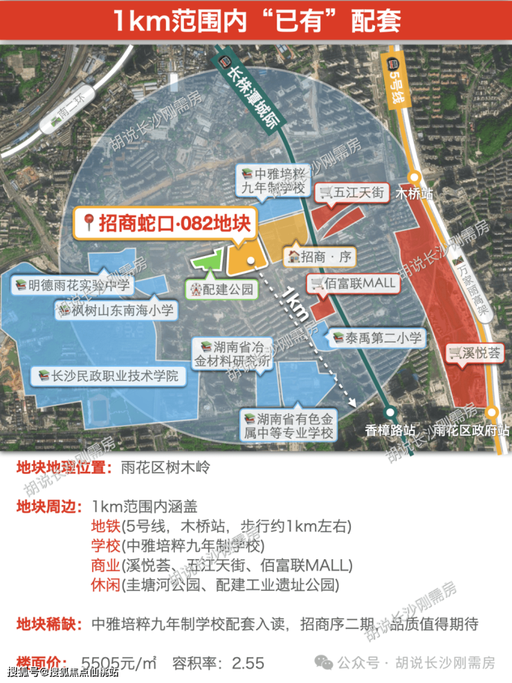 雨花区树木岭片区082地块,招商蛇口摘得,既今年3月摘得008地块开发招商序后再次拿地,楼面价比招商序(5305元/㎡)贵200元/㎡,同样可配套鼓风机厂中雅培粹九年制学校,同时需配建工业遗址公园,但离地铁站更远,容积率略低(招商序2.6),且看未来如何打造;招商序一期测评文章→招商序 | 始于颜值,止于价格?聊聊雨花区树木岭这个网红盘