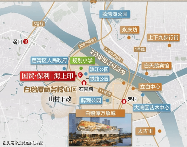 地段决定了配套,海上印位处白鹅潭核心位置:今年要开业的万象城、湾区艺术中心,坐1站地铁就到;想逛滨江太古里,两站地铁也能直达,不管是日常购物、吃饭,还是周末看展、遛娃,都不用跑远,真正的“家门口的顶奢配套”。