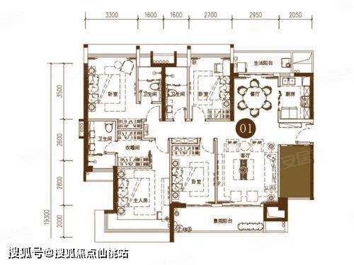 洋房户型;3室2厅2卫1厨, 建筑面积约98平米