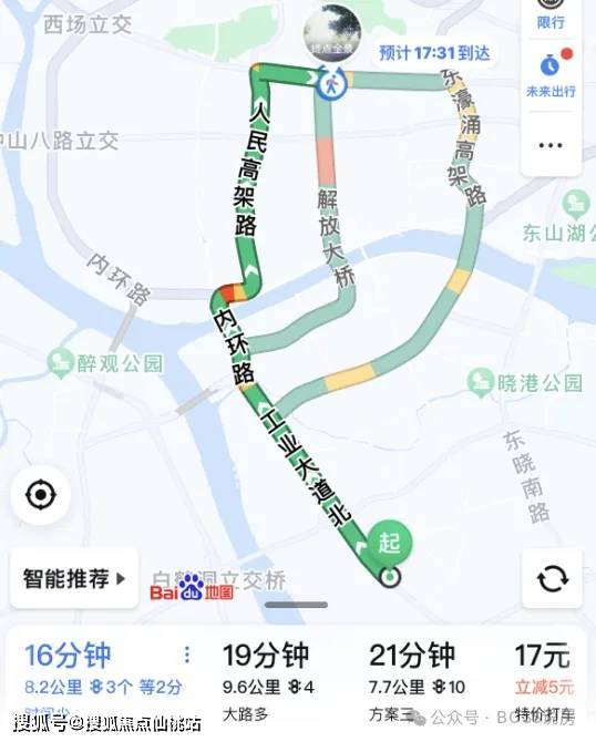 自驾到越秀纪念堂,走工业大道北转内环,再走人民高架路,3个红绿灯,大概16分钟左右;