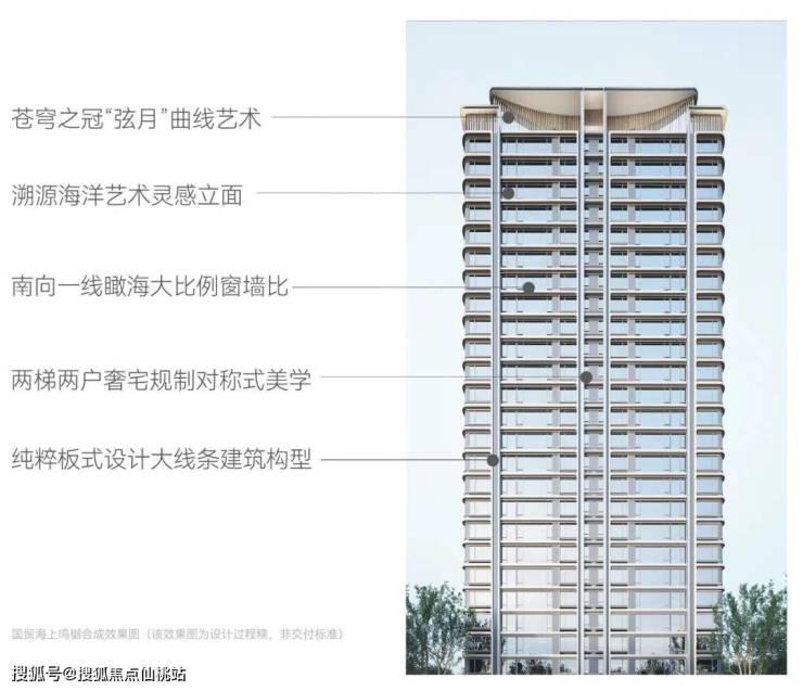 项目不仅以“海上生明月”理念,融合海洋色彩灵感与线条,建筑顶部以苍穹之冠“弦月”曲线艺术为手法,定制海洋美学立面。