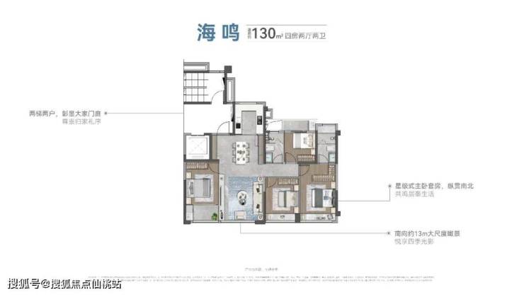 建筑面积约168㎡则超越大部分同级户型,实现了主卧双面瞰景、超72m中庭视距和74m瞰海景观面的三重优势。