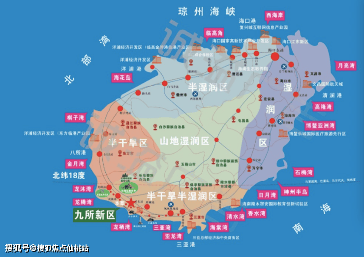 像海口、临高、儋州、东方、文昌、琼海、定安、屯昌、万宁、琼中等地都属于岭北区域,冬季寒冷湿润,夏季高温多雨,四季分明。而乐东、三亚、陵水位于北纬18度以内,属于岭南区域,夏无酷暑,冬无严寒,阳光充足,气候适中,非常适合居住。众所周知北纬18度这个纬度圈穿越了多个著名的旅游度假胜地,如夏威夷、马尔代夫、巴厘岛、墨西哥城等地,因此被称为旅游度假的“黄金纬度”。九所新区属于热带季风气候,冬季温暖干燥,适合避寒。这种气候吸引了大量候鸟老人前来过冬,使得九所新区成为东北人喜欢的避寒胜地。此外,九所新区还有丰富的自然景观和旅游资源,如尖峰岭国家森林公园和天涯海角、南山、大小洞天等著名景点。