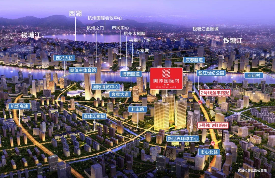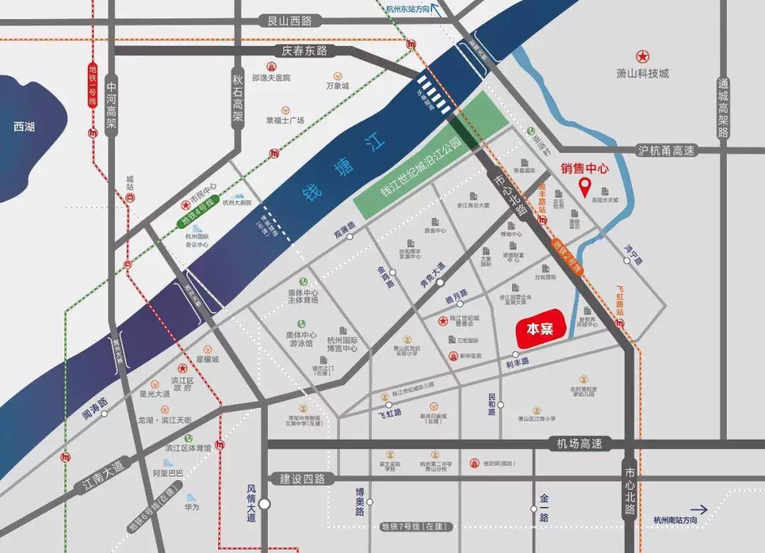 奥体国际村临地铁2号线盈丰路、飞虹路双地铁口,附近6号线、7号线在建,庆春隧道、博奥隧道(在建)、西兴大桥等通达全城,杭州东站、南站、城站三大高铁站围绕还有机场高速无缝对接杭州萧山国际机场,