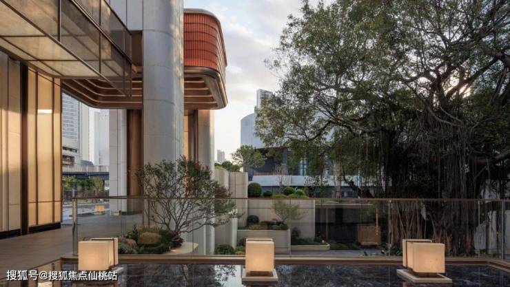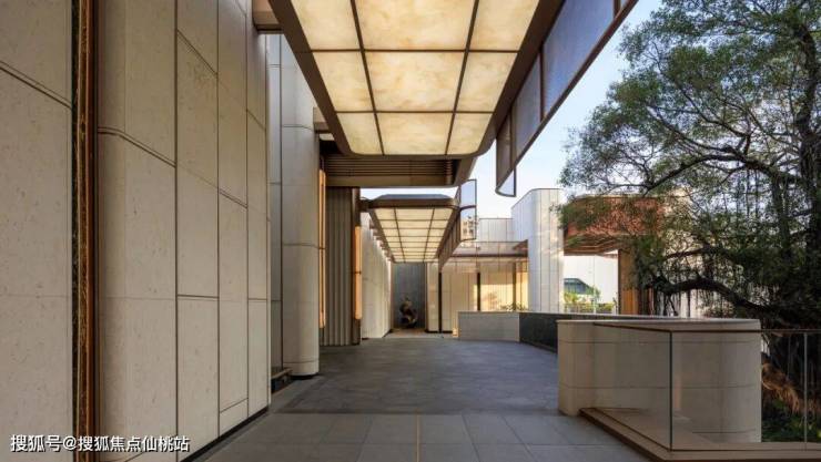 步入4米宽的归家走廊,外侧可以看到百年榕树与榕树广场的盎然绿意,静谧自然的氛围扑面而来。内侧以透光石材吊顶与装饰墙面营造奢雅质感。回望10米高的门头,空间的序列感与仪式感相互交织,构筑出温馨而尊贵的归家体验。