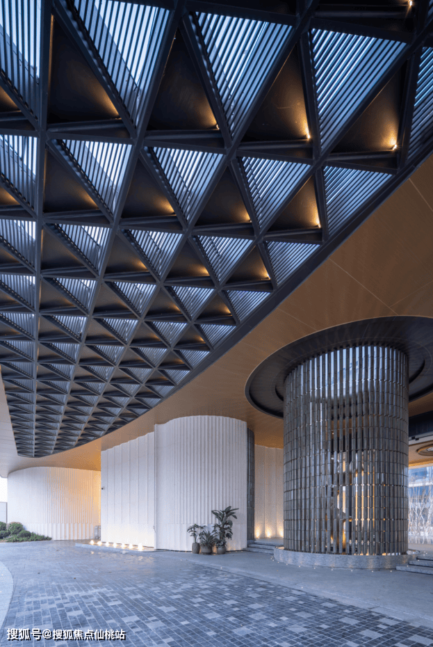 人车分流,行车环岛,顶部铝板镂空式设计,石材背景墙也是做了圆润化,整个色系选的也很有低调奢华感,还有个屏风中转的艺术装置......归家仪式感做得很足。