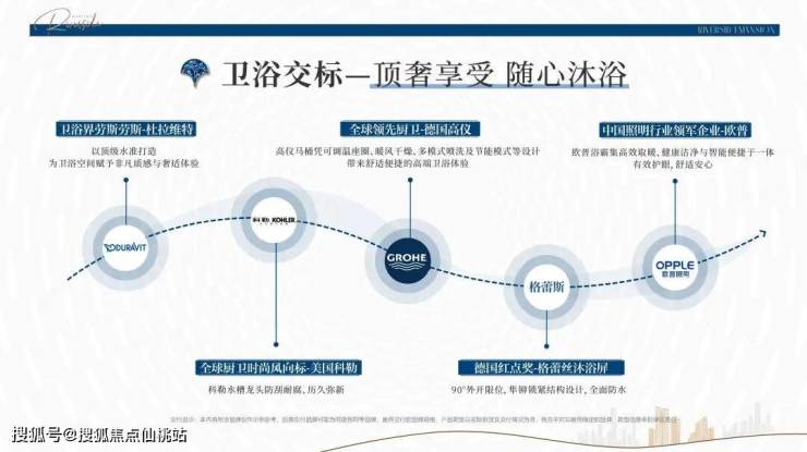 比如,卫浴空间参考五星级酒店标准,全系配置杜拉维特、摩恩、高仪、科勒等精装品牌,打造舒适的卫浴体验。