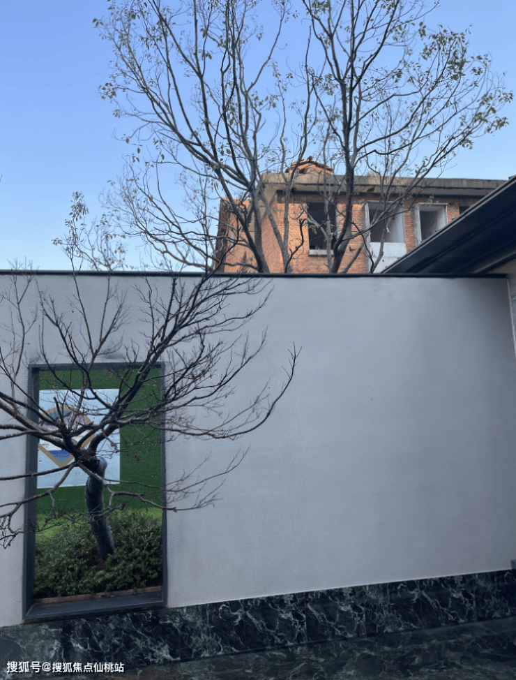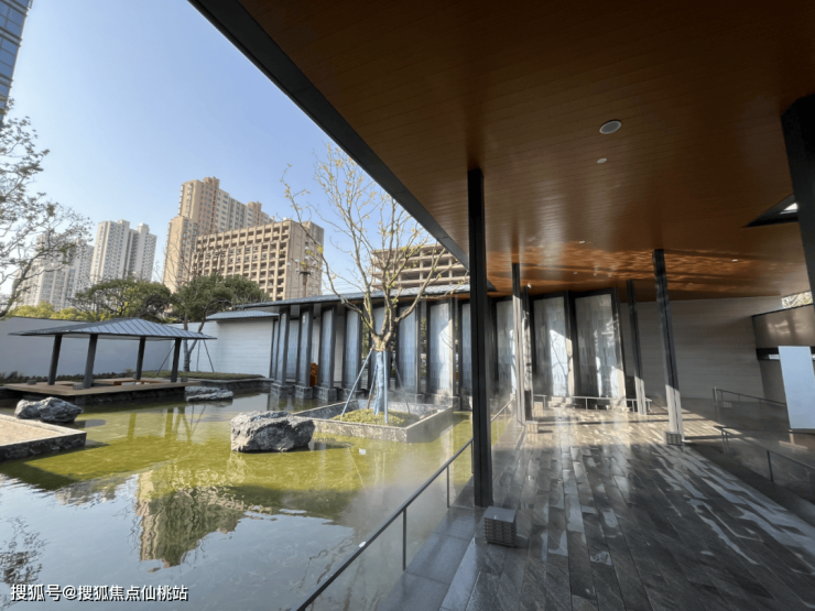 进来一段风雨连廊,还有玻璃屏风、观景亭、水景等,还点缀了红砖元素。
