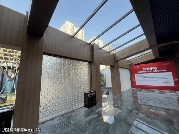连廊转角还有一个保交楼的承诺:逾期超3个月末交付,按《商品房买卖合同》房屋总价105%回购。
