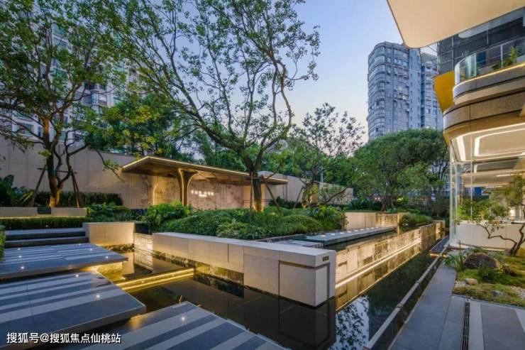 东侧迎宾叠水气势不凡,西侧和光水院静谧雅致,双水系与澄碧湖水景遥相呼应,水脉相连。