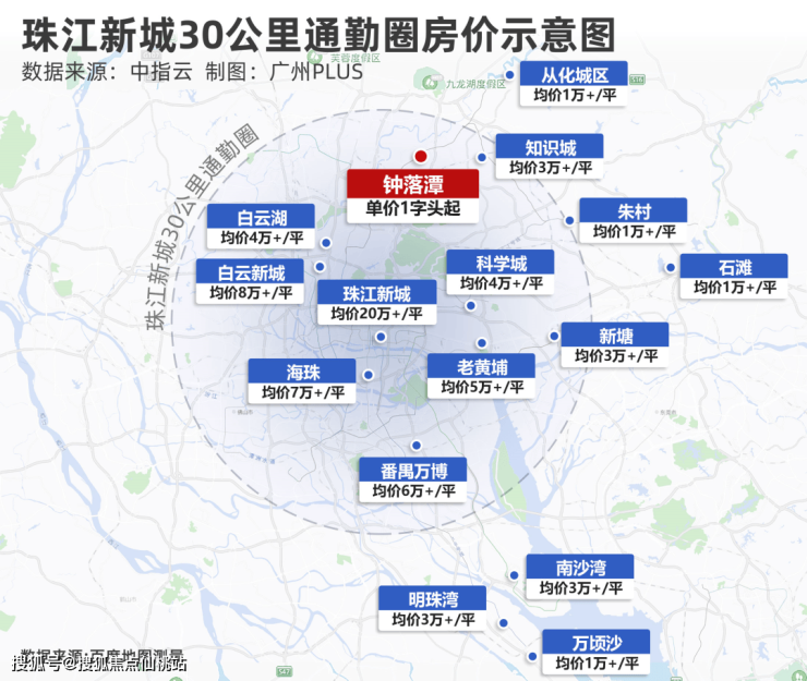 摊开广州地图就可以看到,珠江新城30公里通勤圈内,绝大多数板块的价格要到4万+/㎡。