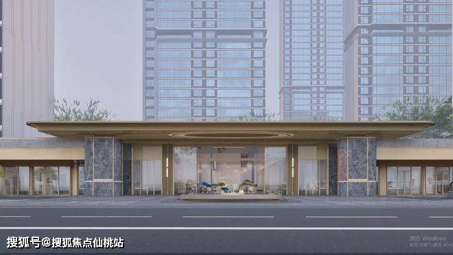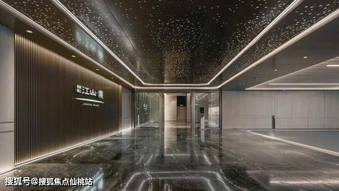 “江山云起”的水景雕塑、庄重典雅的金色格栅吊顶超高挑空门楼组成了辨识度极高的酒店化主入口;