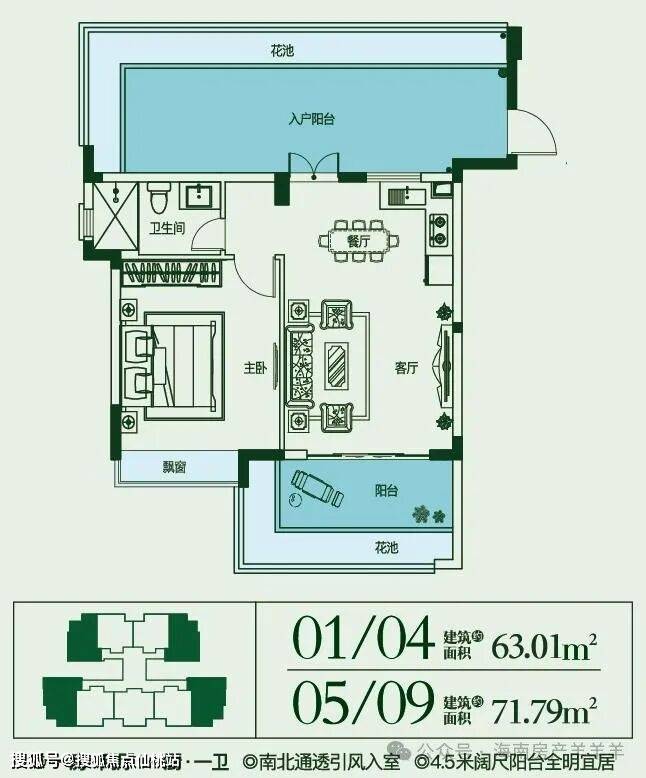 建面约63~72㎡,1房2厅1厨1卫
