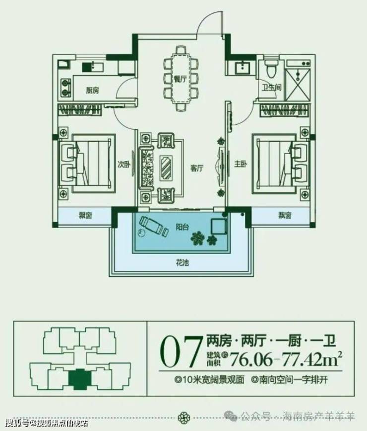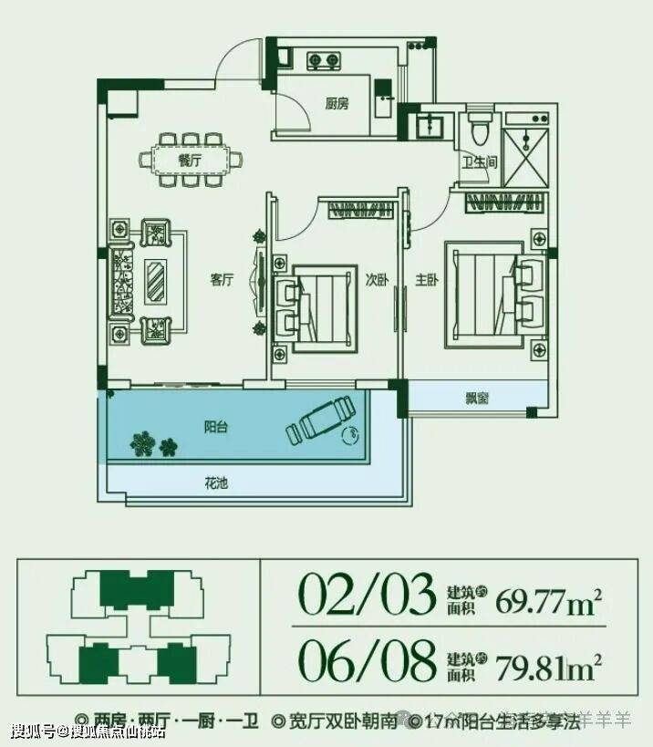 建面约70~80㎡,2房2厅1厨1卫