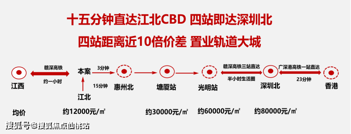 天璨距高铁北站(已通车)直线距离1公里,3分钟即达高铁北站(已通车),15分钟直达江北CBD,30分钟直通深圳,一小时通香港,开启便捷的双城生活。