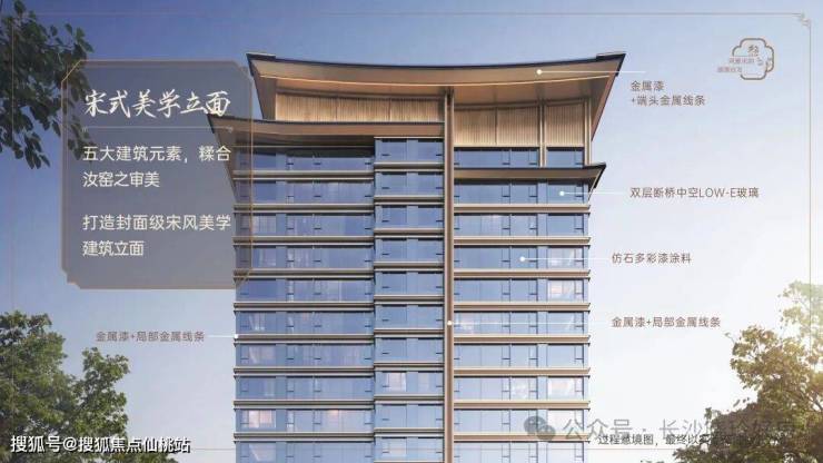 臻材实料:东方美学公建化立面,宋韵飞檐造型,高级配色金属材质线条+隔音隔热性能俱佳的LOW-E玻璃+深灰色真石漆基底,打造历久弥新的美学立面。