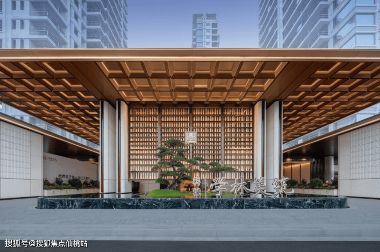 主入口门庭以学府高雅气质与庄重高墙规制面向城市,营造一方落客港湾,迎接高知菁英入境。臻选冠幅近5.5米的名贵迎客松,并以600余片定制青玉打造巨幕奢石景墙,呈现尊崇且轻松的惬意归家感。