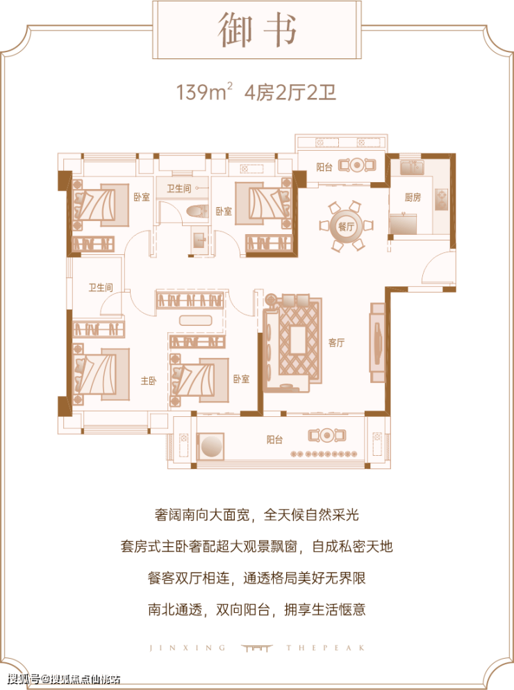 建面约139㎡奢阔四房,科学户型设计,为团圆的喜悦更添一笔幸福色彩。餐客一体设计,提供了宽敞的互动空间,从容应对亲友的新春欢聚时光。南北双阳台、南向跑道式双联阳台,大尺度打开空间的景观格局,静赏一园江南美景,迎接新年的喜悦。