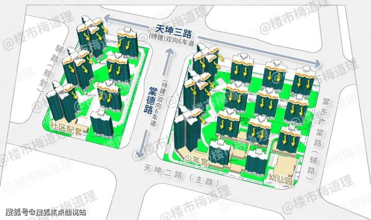 项目分为东、西两个地块,北侧临近天坤三路(双向6车道),南侧靠天坤二路,中间被棠德路(双向6车道)隔开。