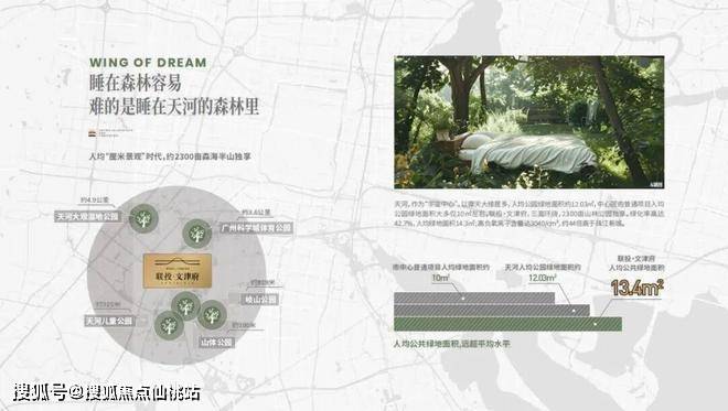 三面约2300亩公园环绕,人均绿地面积约13.4㎡,其负氧离子含量高达3040/cm³,是珠江新城的44倍。